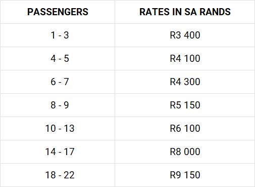 Price is strictly From: OR Tambo, Lanseria, Pretoria Sandton or Johannesburg.